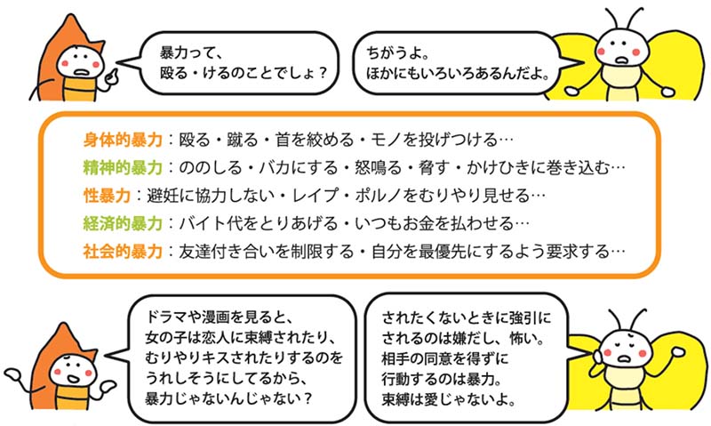 若者たちの多くは暴力に対する認識が浅いため、言葉や身体の暴力を受けていても自分がデートDVの被害者だと気づけなかったり、大切な相手の人権を傷つけていても、自分が悪いとは自覚できないことが少なくありません。