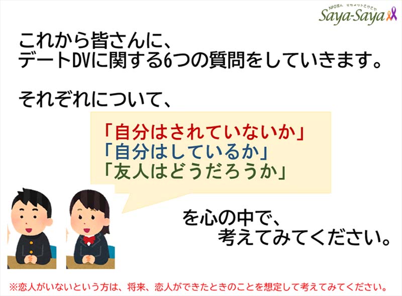 また、人数に応じてグループワークなどの話し合いを通じて、より具体的にデートDVについて学んでいくことができます。